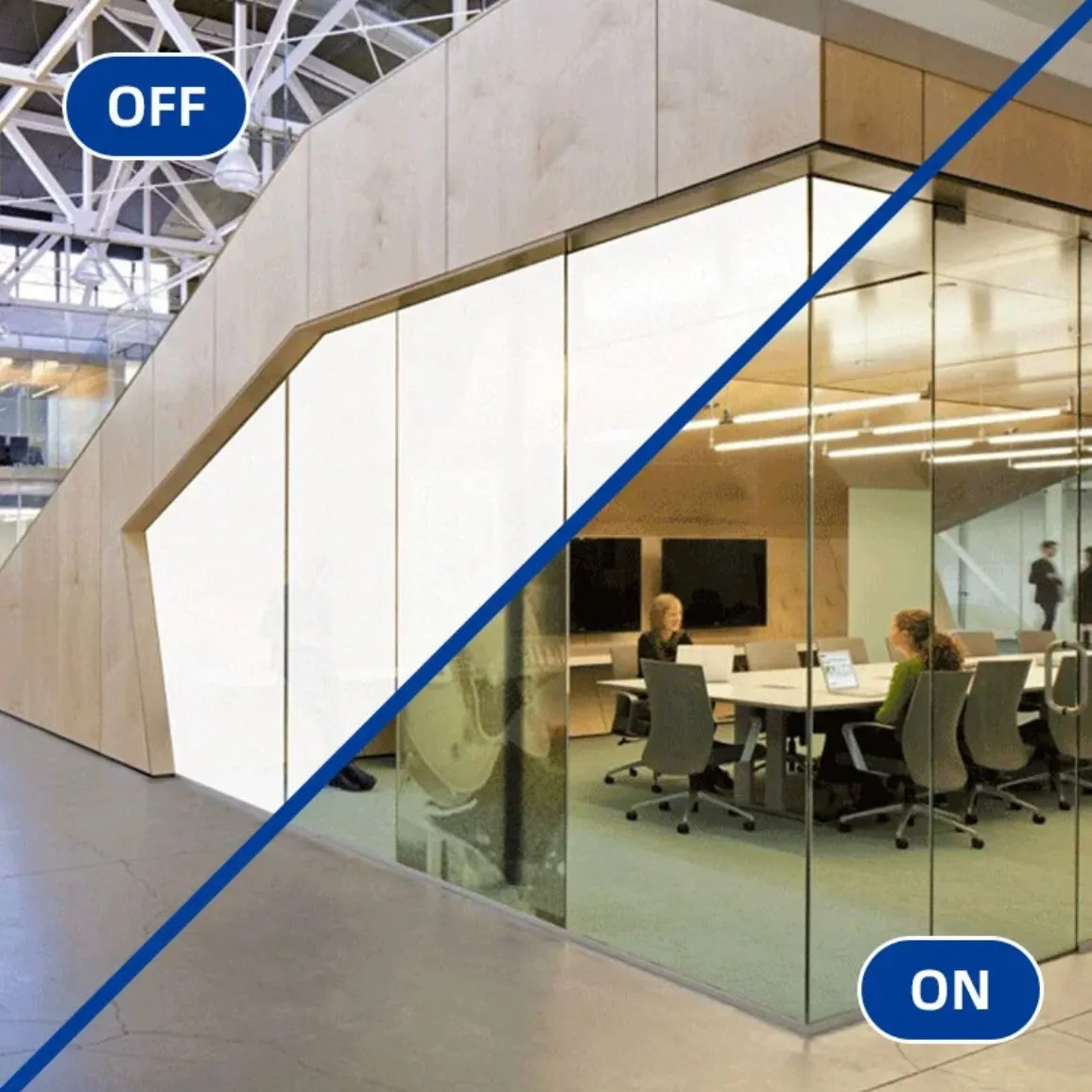 Mengubah kaca dari transparan ke buram untuk privasi seketika.