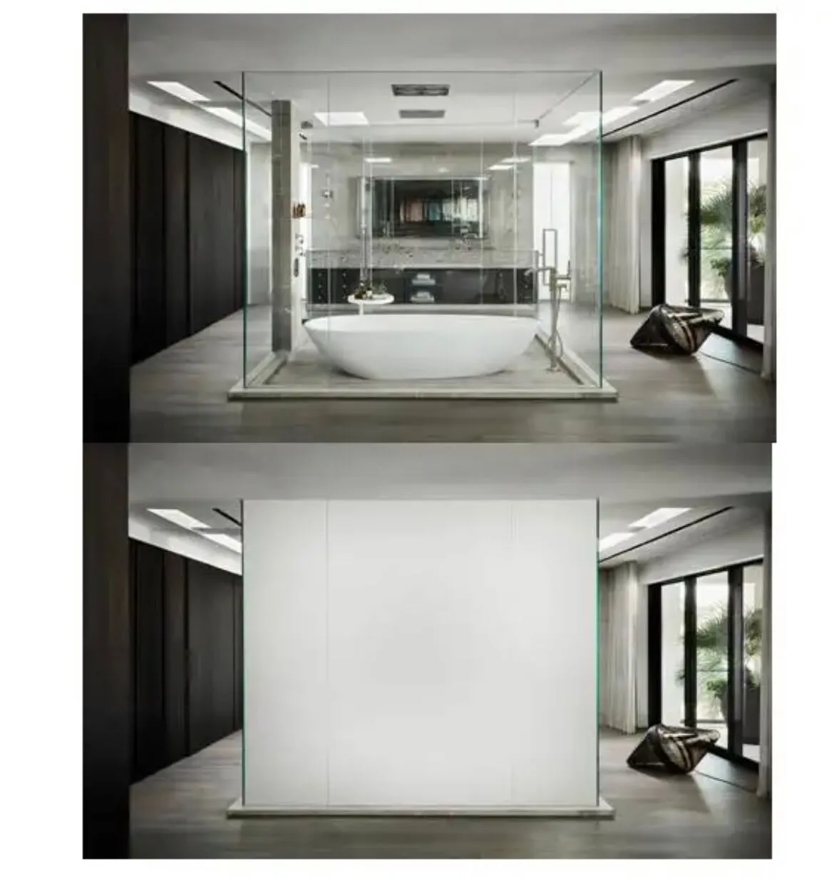Kaca dapat diatur untuk menjadi transparan atau buram secara otomatis dengan satu sentuhan tombol atau remote control.